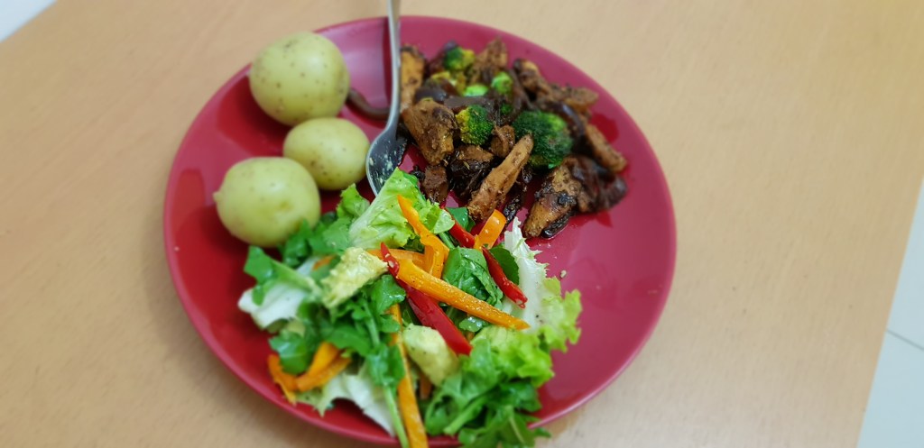 Sauteed Broccoli and Chicken breast with baby potatoes and salad
